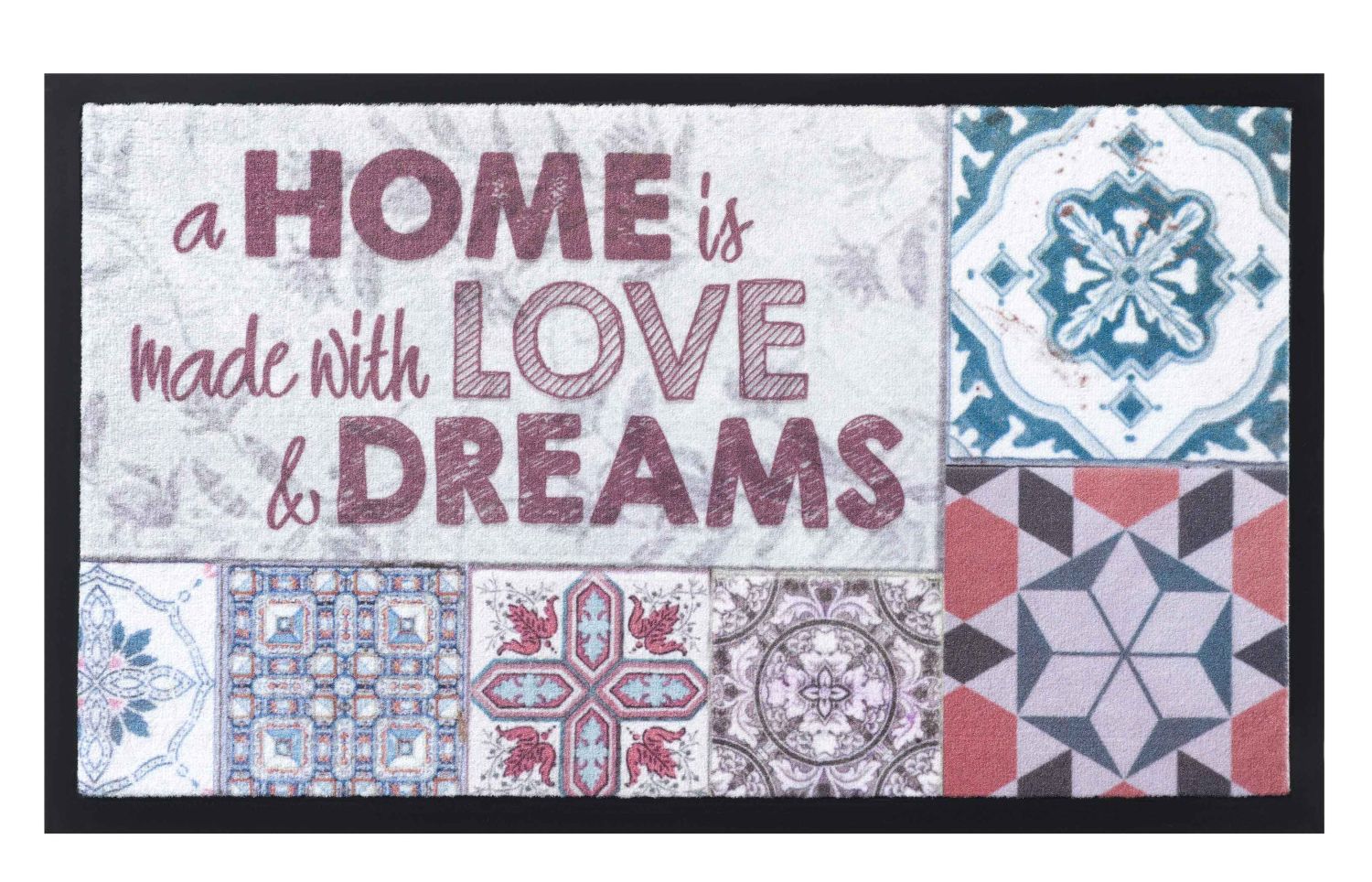 Tapis personnalisé fabriqué avec des fibres de polyamide pour absorber la saleté et l'humidité, à motifs orné de l'inscription A Home Is Made With Love & Dreams, fonctionnel et décoratif.